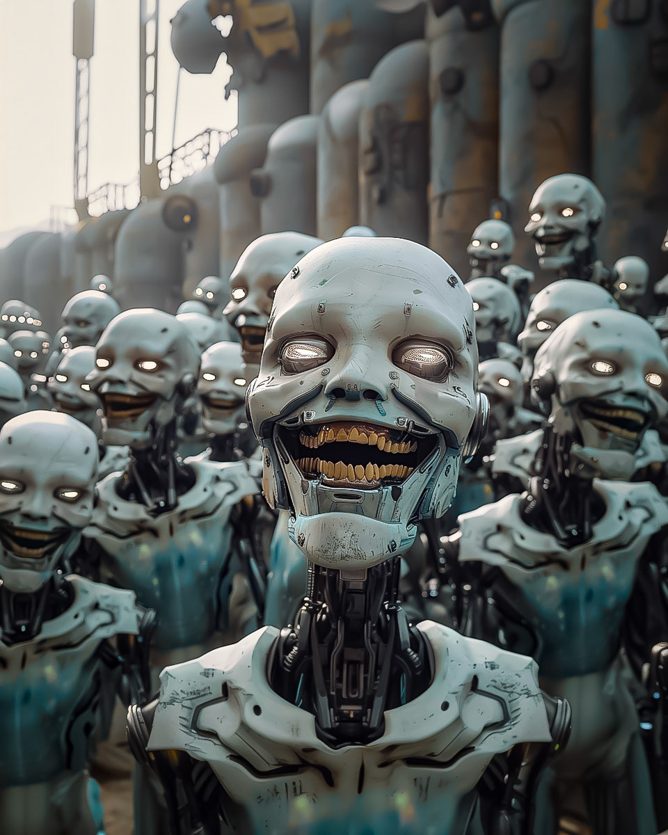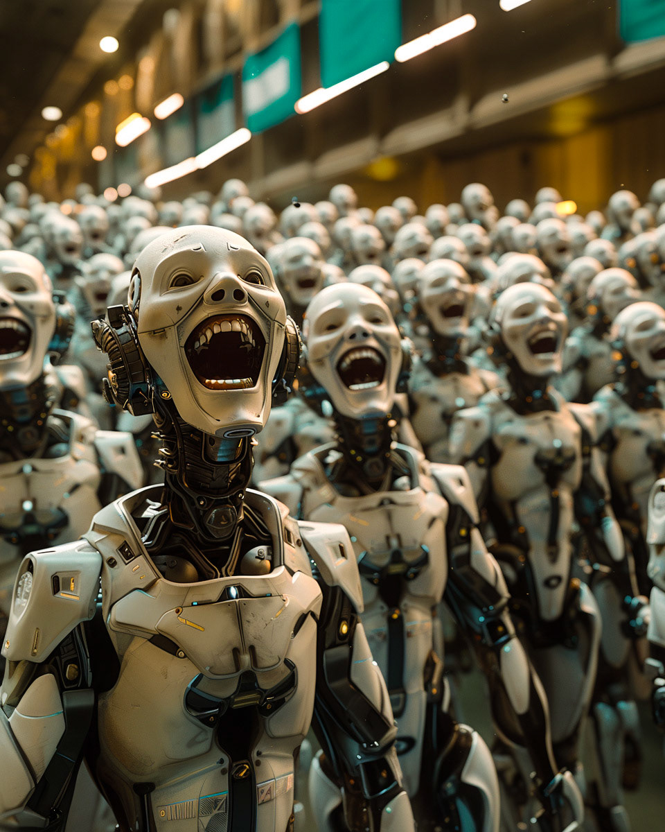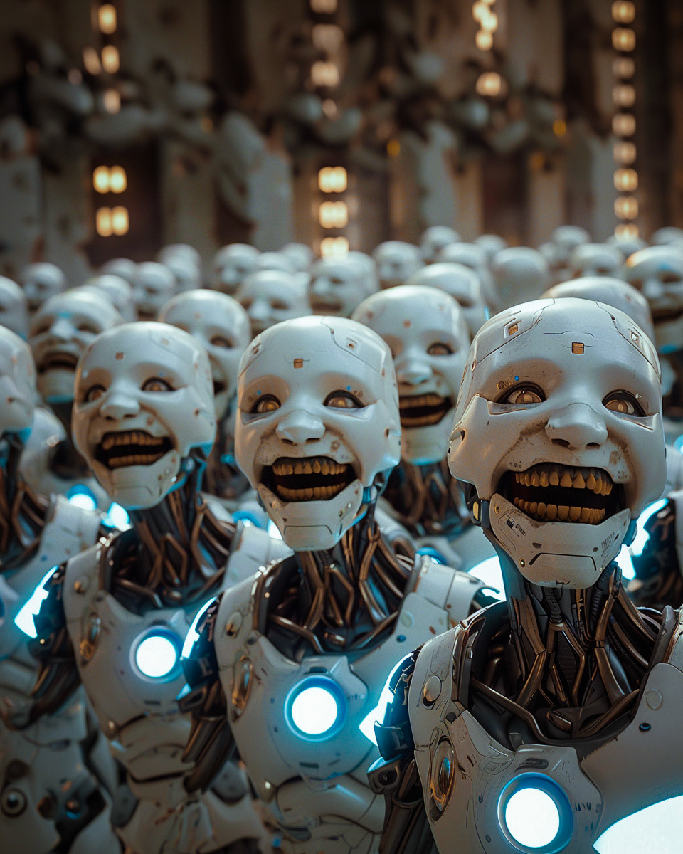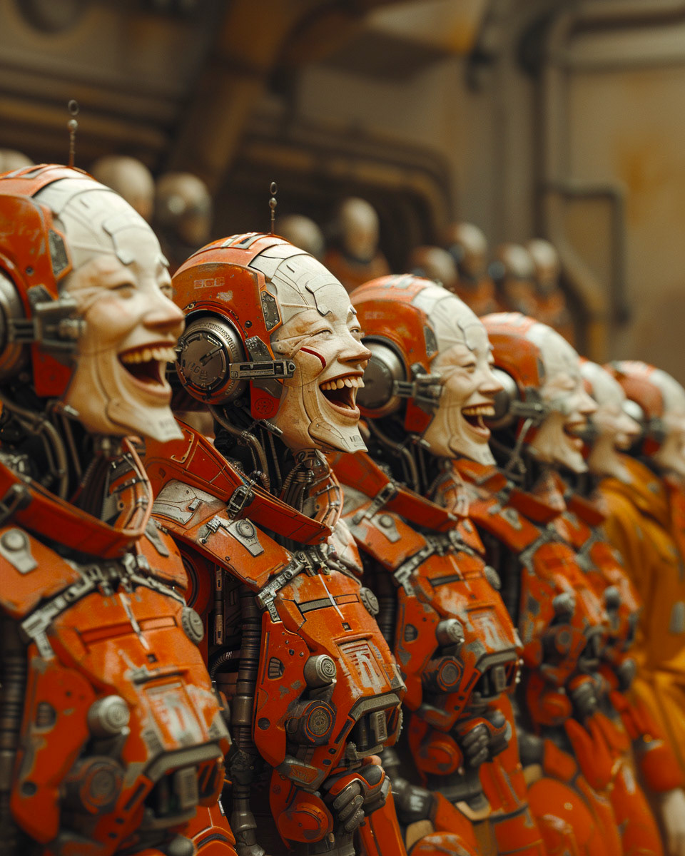Les sourires mécaniques imitent le rire rare et creux propre à la folie humaine.