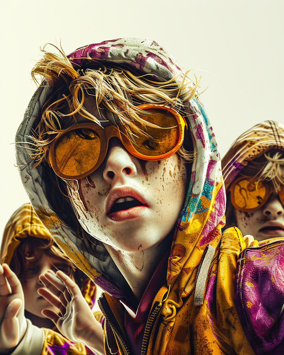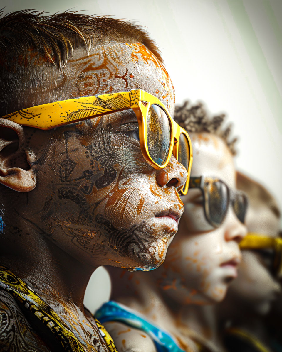 Des visages audacieux émergent de motifs complexes, révélant un kaléidoscope d'émotions cachées dans chaque détail vibrant.