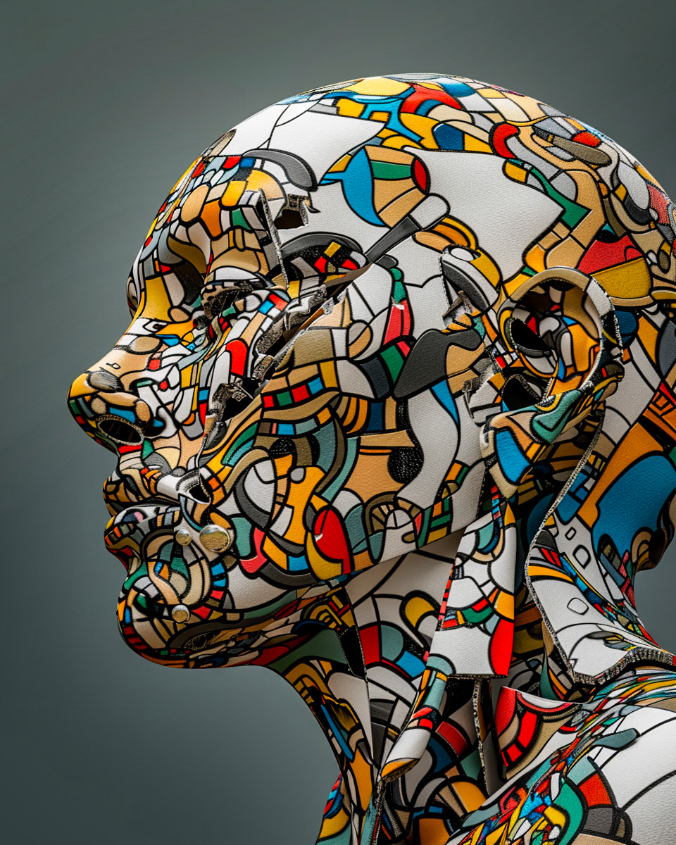 Des visages audacieux émergent de motifs complexes, révélant un kaléidoscope d'émotions cachées dans chaque détail vibrant.